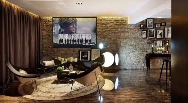 深色皮革的床背景,大花紋的啡色大理石地面,都是對沉穩(wěn)、專注和堅毅的男性魅力的間接描述。大面積的自然石墻面體現(xiàn)出一種原始的粗獷質(zhì)感,深沉穩(wěn)重的色調(diào)和燈光效果演繹出男主人的成熟魅力。